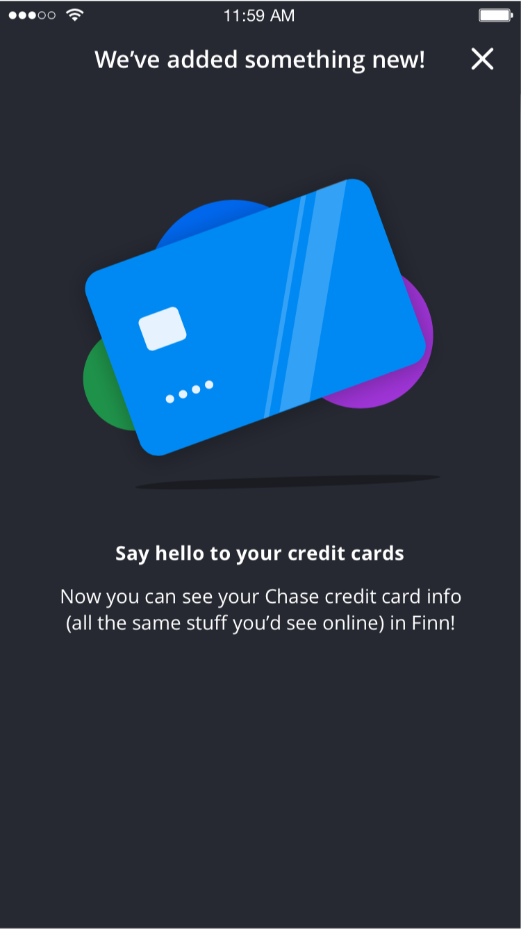- Add Chase’s existing credit card experience to the Finn app, so users can see all their spending in one place