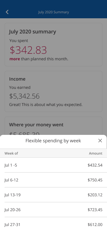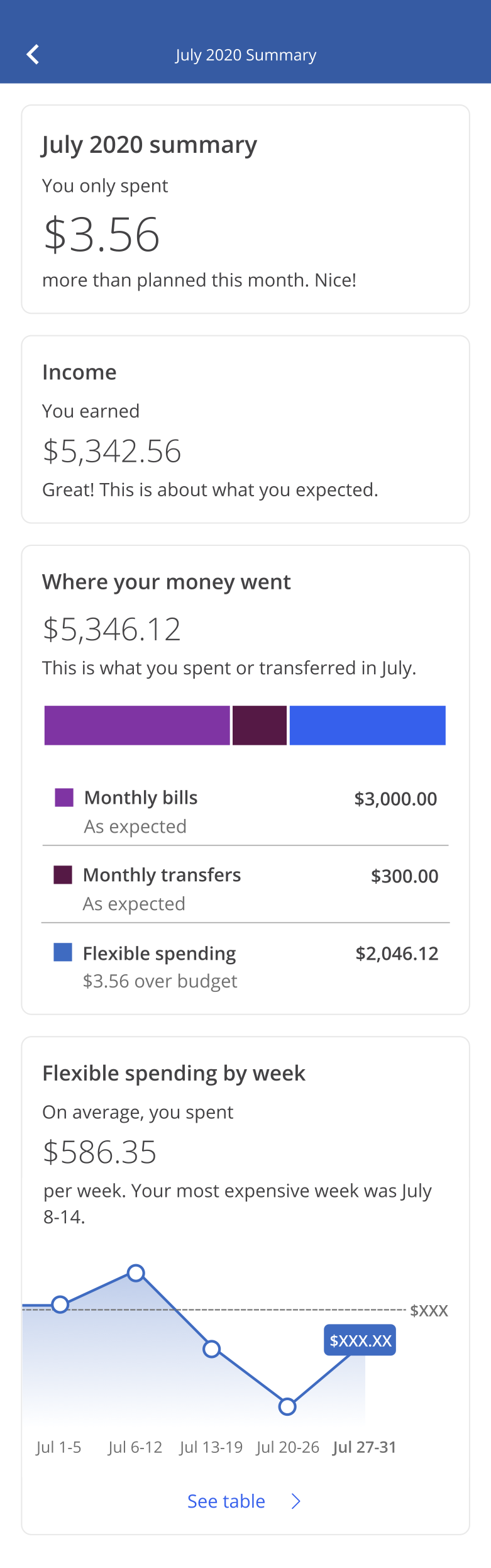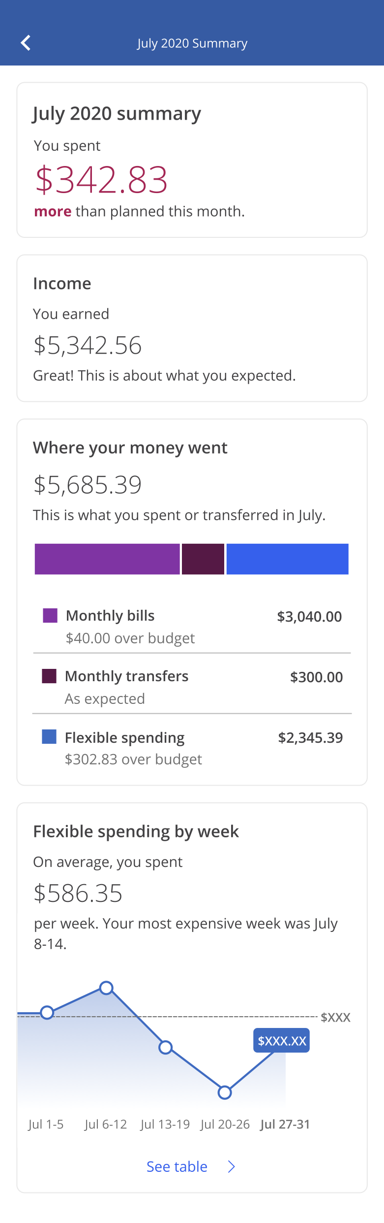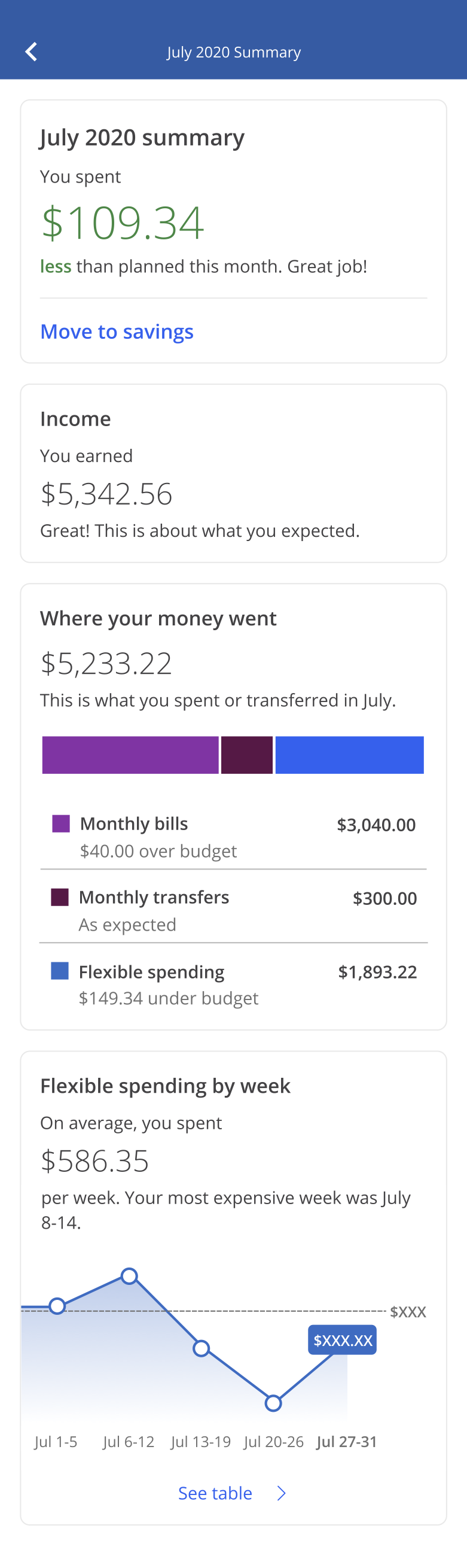 The end-of-month summary shows users how they did with their budget that month, and recaps their spending, income, bills and transfers. It shows if users were over/under estimates, and by how much. If you have extra cash left over in your budget, you can move it to your savings.